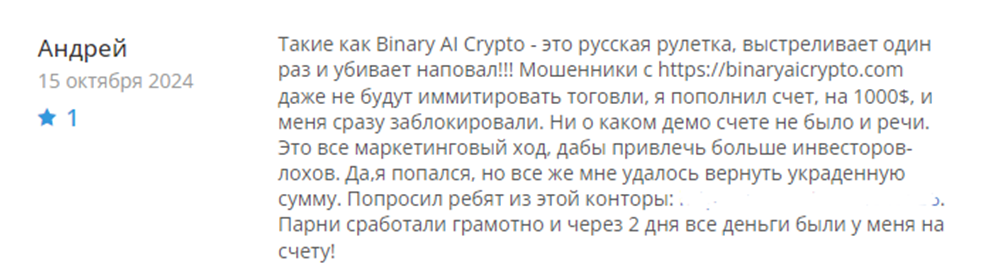 Binary AI Crypto уже успел собрать вокруг себя множество негативных отзывов от пострадавших клиентов. В большинстве своем отзывы указывают на невозможность вывести средства с платформы после депозита и отсутствия поддержки со стороны компании. Клиенты жалуются на то, что после внесения средств на платформу становится практически невозможно их вывести. Платформа затягивает время, игнорирует запросы и ставит невыполнимые условия для вывода.