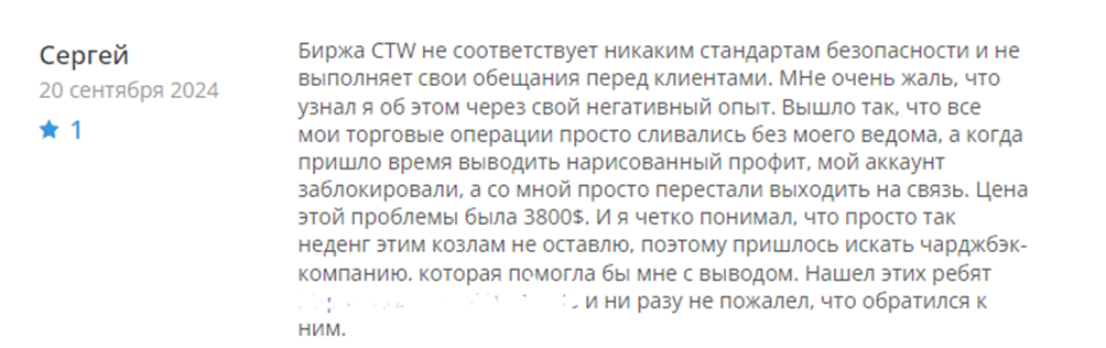 Мошенническая биржа CTW вызывает негативные отзывы среди клиентов, ставших жертвами её действий. Несмотря на отсутствие информации о компании, многие пострадавшие сообщают о проблемах с выводом средств и неэффективной работе службы поддержки. Одним из самых распространённых жалоб является то, что пользователи не могут вывести свои средства после успешной торговли. Многие отмечают, что при попытке сделать вывод средств, платформа либо игнорирует запросы, либо отклоняет их под предлогом «технических проблем».