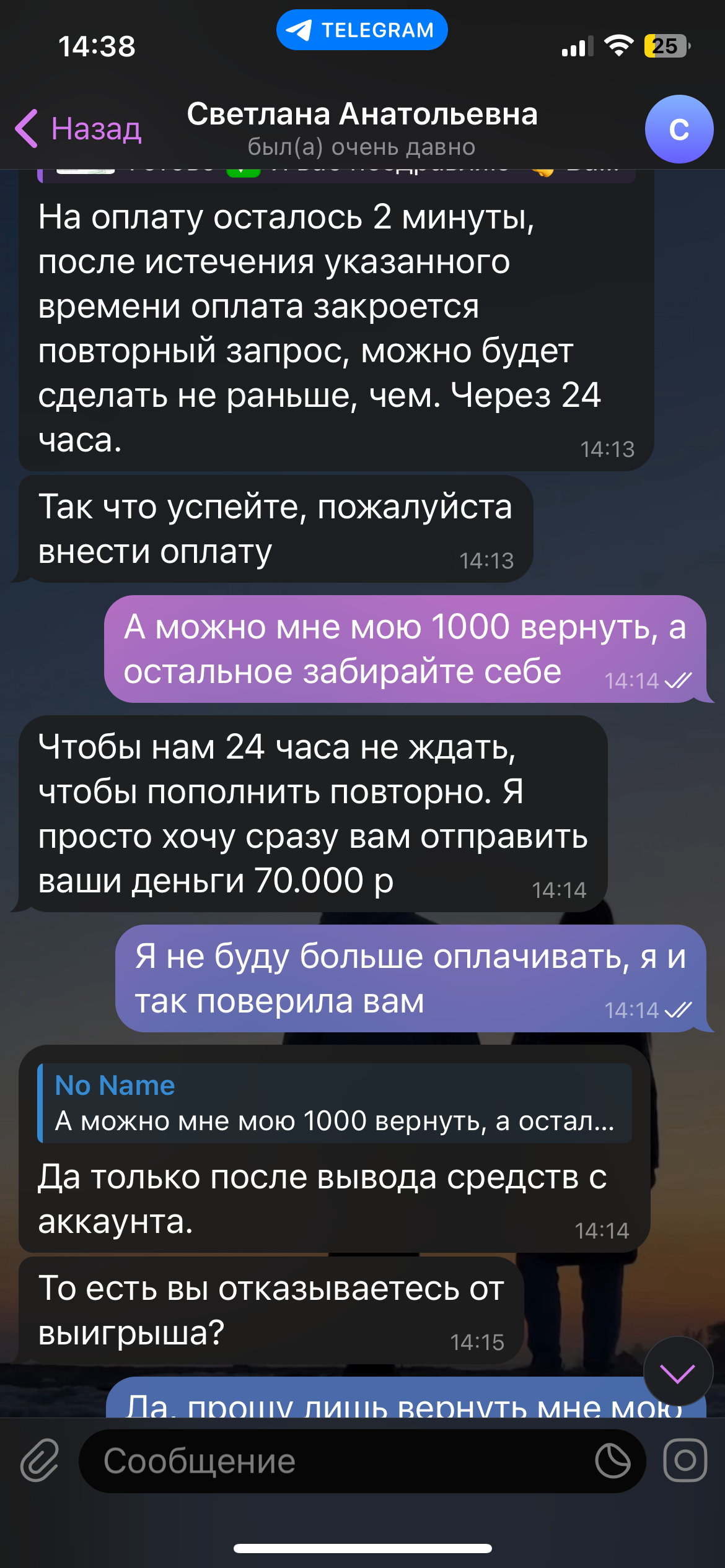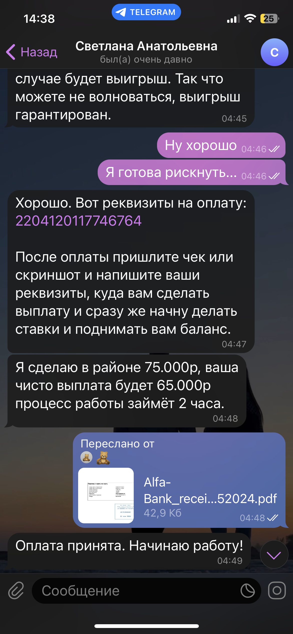 Добрый вечер. Я сделала ставку в казино телеграмма, но чтобы вывести выигрыш мне предложили пройти верификацию и положить на депозит 8000 руб.